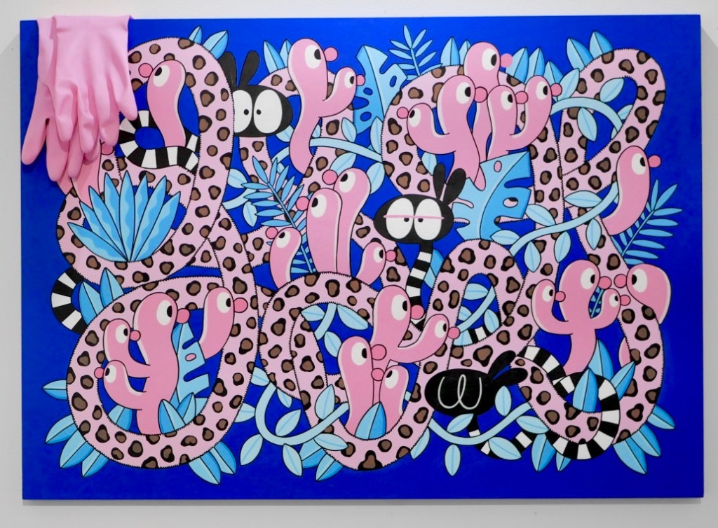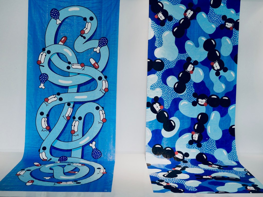 At the gallery, Yeka Haski didn’t just stick with the traditional kind of canvas to display her work. In one display she uses blue plastic sheets, two of which are hung, the third being curled into a wave frosted with white plastic bags. This was interesting from an anthropological perspective because in many ways this medium is an important part of Japan’s modern material culture. During Hanami, cherry blossom viewing time in Japan, most parks will be strewn with these sheets which are popular as picnic blankets since they are cheap plus you can gather all the rubbish in them and throw them away at the end. I myself am guilty of using one to this end without even thinking about it, but seeing them in this context made me reflect on this. My favourite of the three is the first, in which she depicts how plastic is in many ways a drug, and we’re addicted. On the far wall, she mounted a collection of plastic bags, one holding the title, and another reminding us that ‘This piece of art will stay forever’. The rest support an array of her characters. When I asked her about these unconventional choices, she explained that in many ways it was a form of recycling, ‘these are mundane objects… it is only art when we say it is’. To her, this was central to her message because; ‘We live in a world where so much already exists, you have to question the need to produce something… there needs to be purpose… this is the necessity of being an artist.’