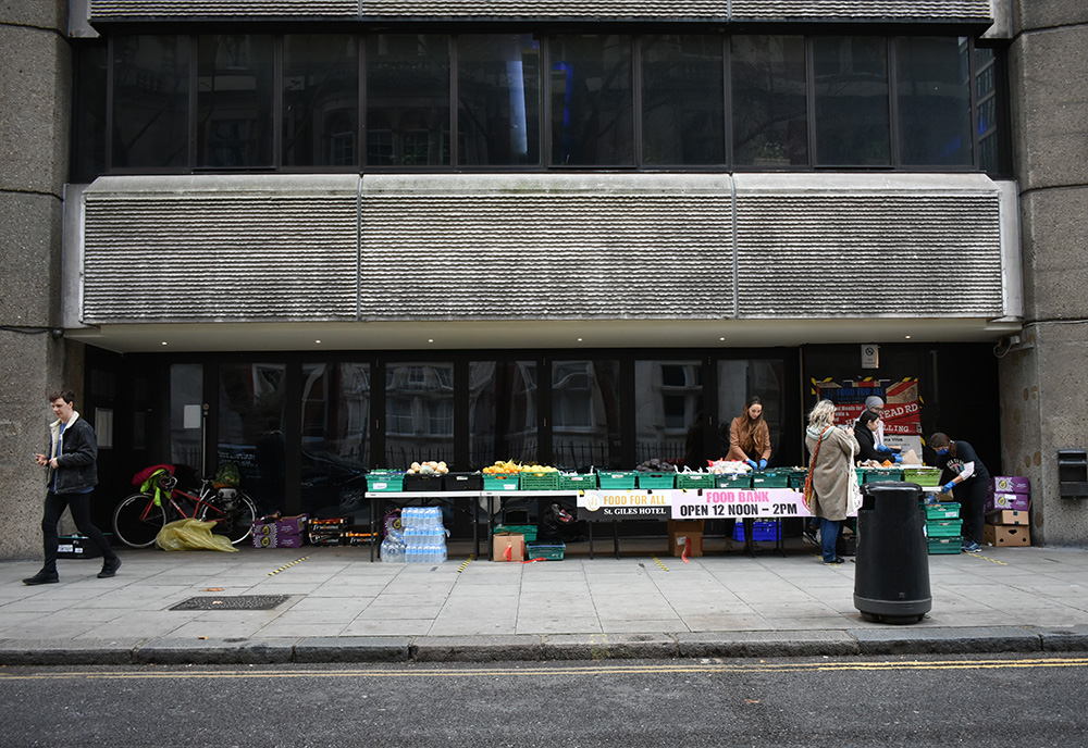It’s a grey, nippy London day on a grey sidewalk on the edge of Bloomsbury, but Jennie Matthias is dancing; her mass of fire-engine-red curls exploding from under her knit cap. She and a group of volunteers are buzzing around several folding tables in front of the St Giles Hotel that are groaning under the weight of freshly cooked curries, heaps of fruit, vegetables, drinks, and pastries. “What time is it?” Matthias, the food hub manager, hollered. “Twelve? Let’s go! Let’s do this!”