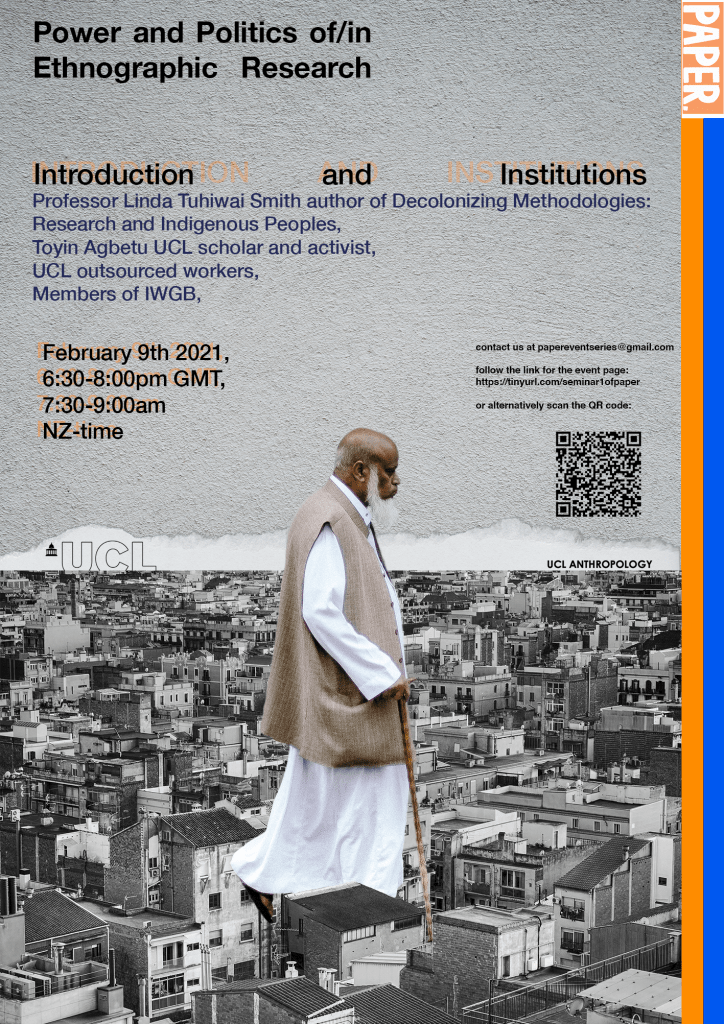 Introducing PAPER, Power and Politics of/in Ethnographic Research; a timely and imperative seminar series, interrogating the ongoing decolonisation of ethnographic fieldwork, with aims to instigate pedagogical progress within the department, enmeshing care as praxis and prioritising decolonial ethical practice within our discipline.