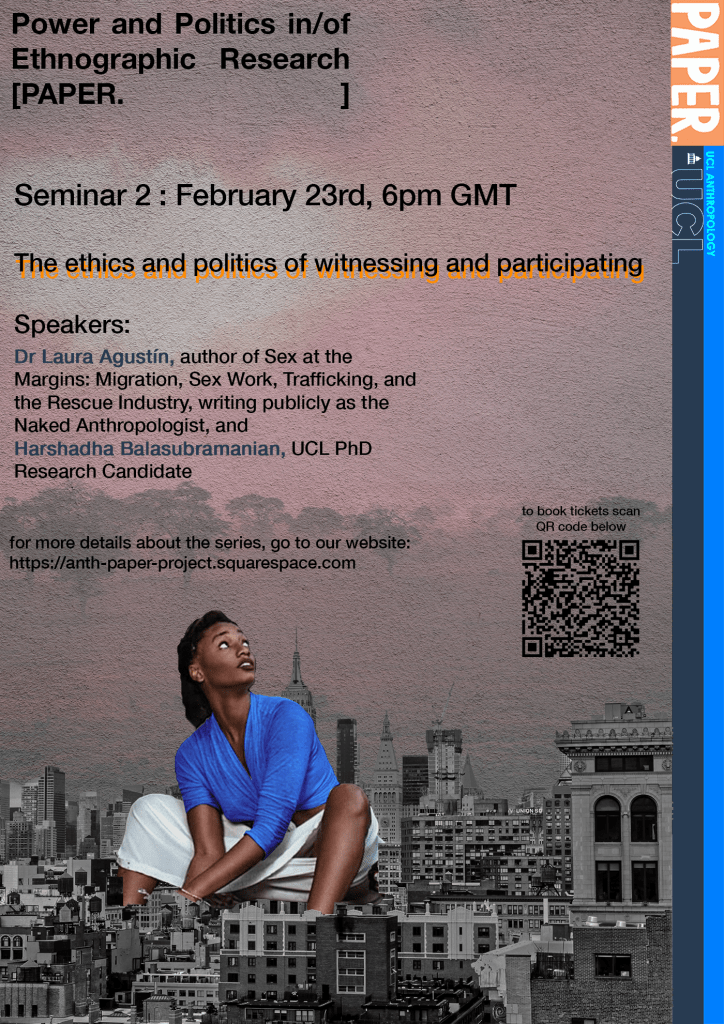 With Dr Laura Agustín, author of Sex at the Margins: Migration, Sex Work, Trafficking, and the Rescue Industry, writing publicly as the Naked Anthropologist and Harshadha Balasubramanian, UCL PhD Research Candidate.
