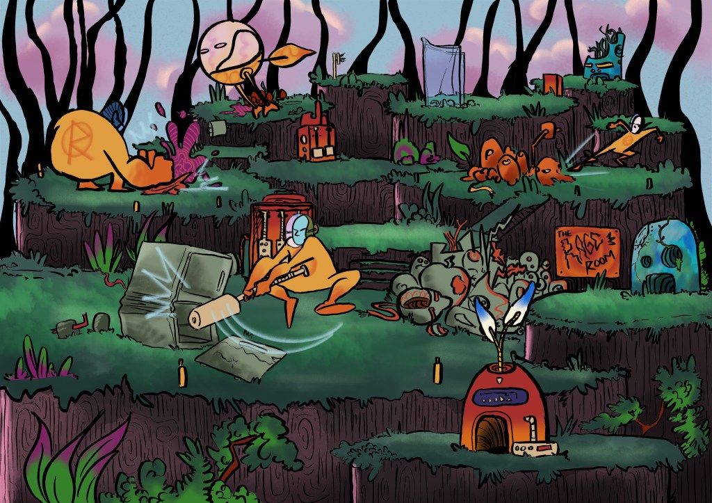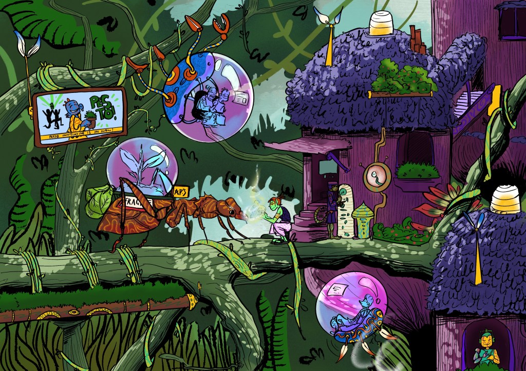 Illustrator and game designer Bobby Satya Ramadhan adds that Evertown’s variegated forest landscape was inspired by Kebun Raya Bogor, a botanical garden in Bogor, Indonesia, located near where Mr. Satyar grew up. A walk through the garden one day brought him face-to-face with a line of red ants busily carrying food down a small branch of a tree – an image which flourished into another element of worldbuilding in Evertown.