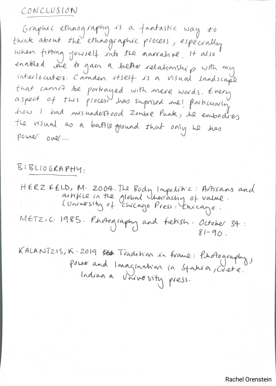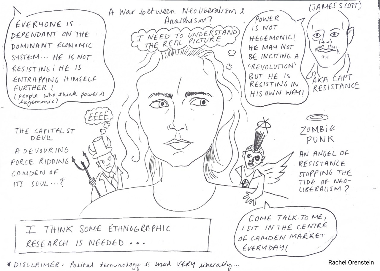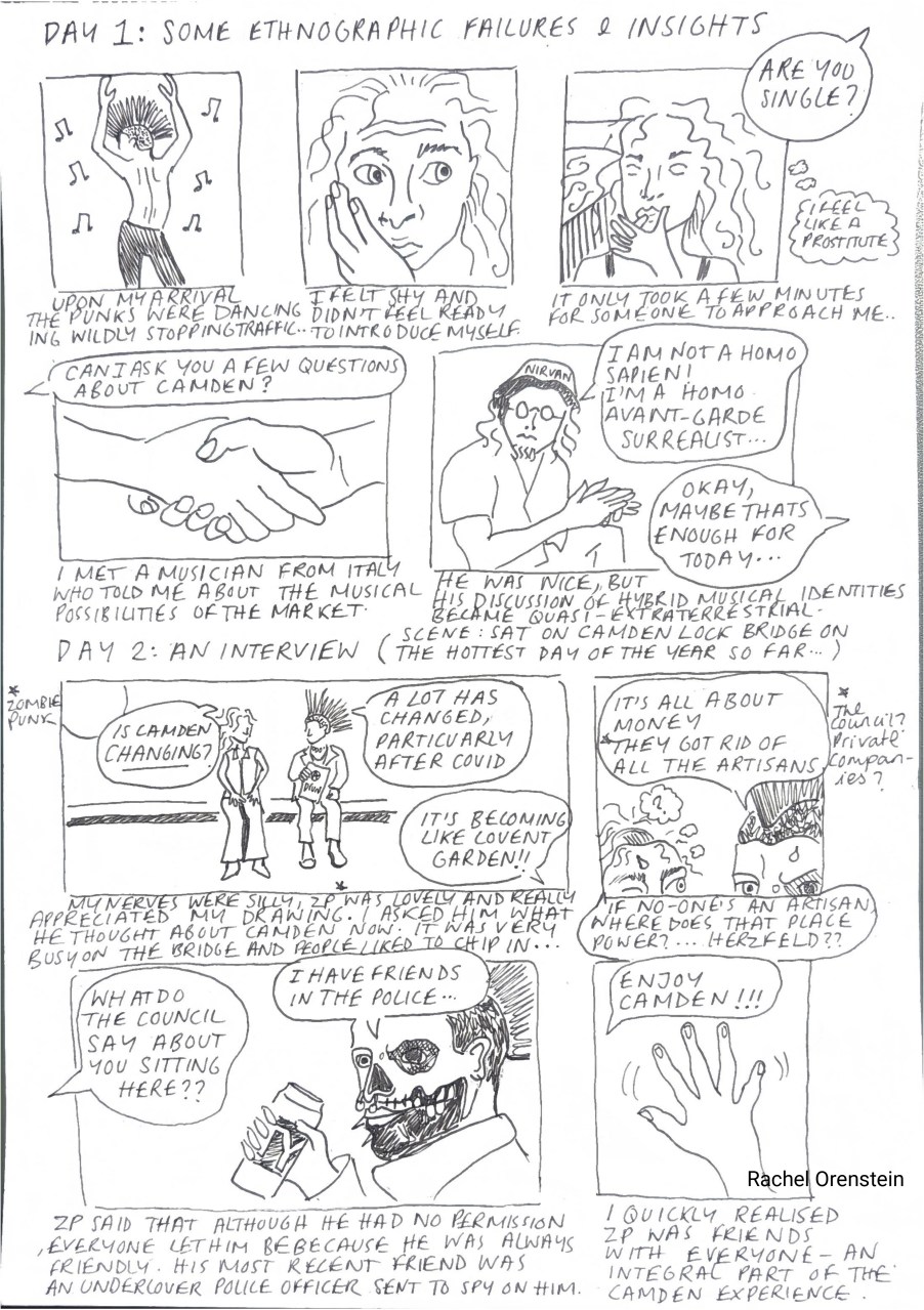 My Comic explores the contemporary nature of ‘punk’ in Camden Market. Starting with my own connection to the area, the Comic ultimately focuses on the ‘punk philiosophy’ of Zombie Punk and other frequent inhabitants of the Lock. Zombie Punk is a notorious local personality who sits, most days, on Camden Lock Bridge with the sign “Help a Punk to Get Drunk”. I was intrigued by his visual use of Anarchism, particularly after seeing many tourists pay him to spray the Anarchist Symbol on their newly purchased Camden leather jackets. I even saw a whole family proudly branded with his ad-hoc art. This Comic recounts my ethnographic interrogation of Zombie Punks actions as a form of social protest.