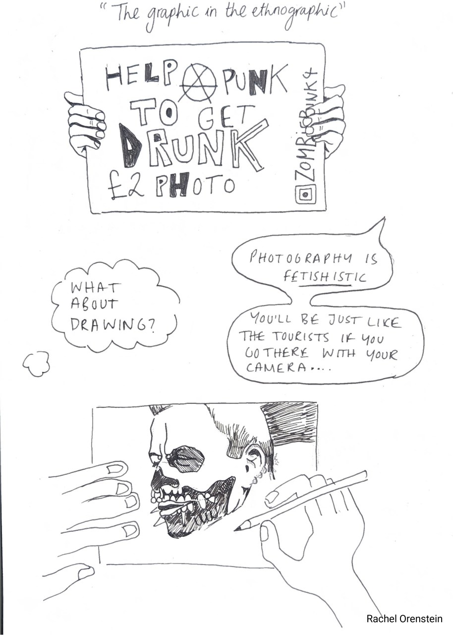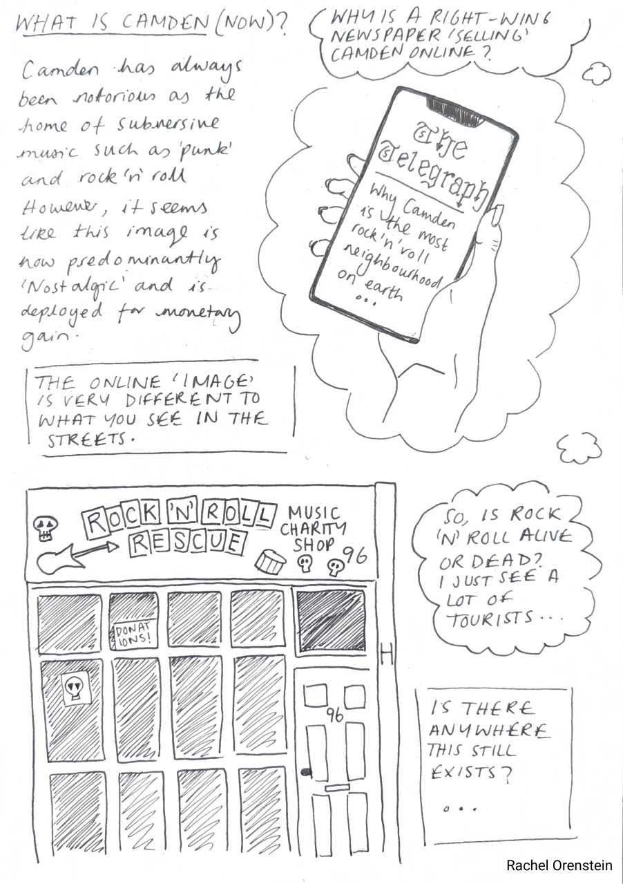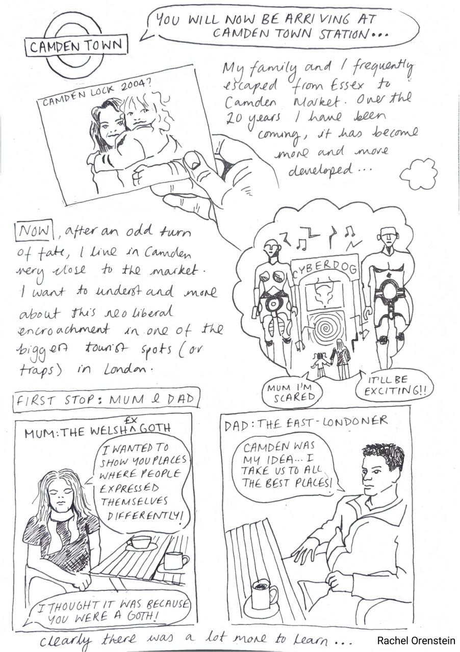 My Comic explores the contemporary nature of ‘punk’ in Camden Market. Starting with my own connection to the area, the Comic ultimately focuses on the ‘punk philiosophy’ of Zombie Punk and other frequent inhabitants of the Lock. Zombie Punk is a notorious local personality who sits, most days, on Camden Lock Bridge with the sign “Help a Punk to Get Drunk”. I was intrigued by his visual use of Anarchism, particularly after seeing many tourists pay him to spray the Anarchist Symbol on their newly purchased Camden leather jackets. I even saw a whole family proudly branded with his ad-hoc art. This Comic recounts my ethnographic interrogation of Zombie Punks actions as a form of social protest.